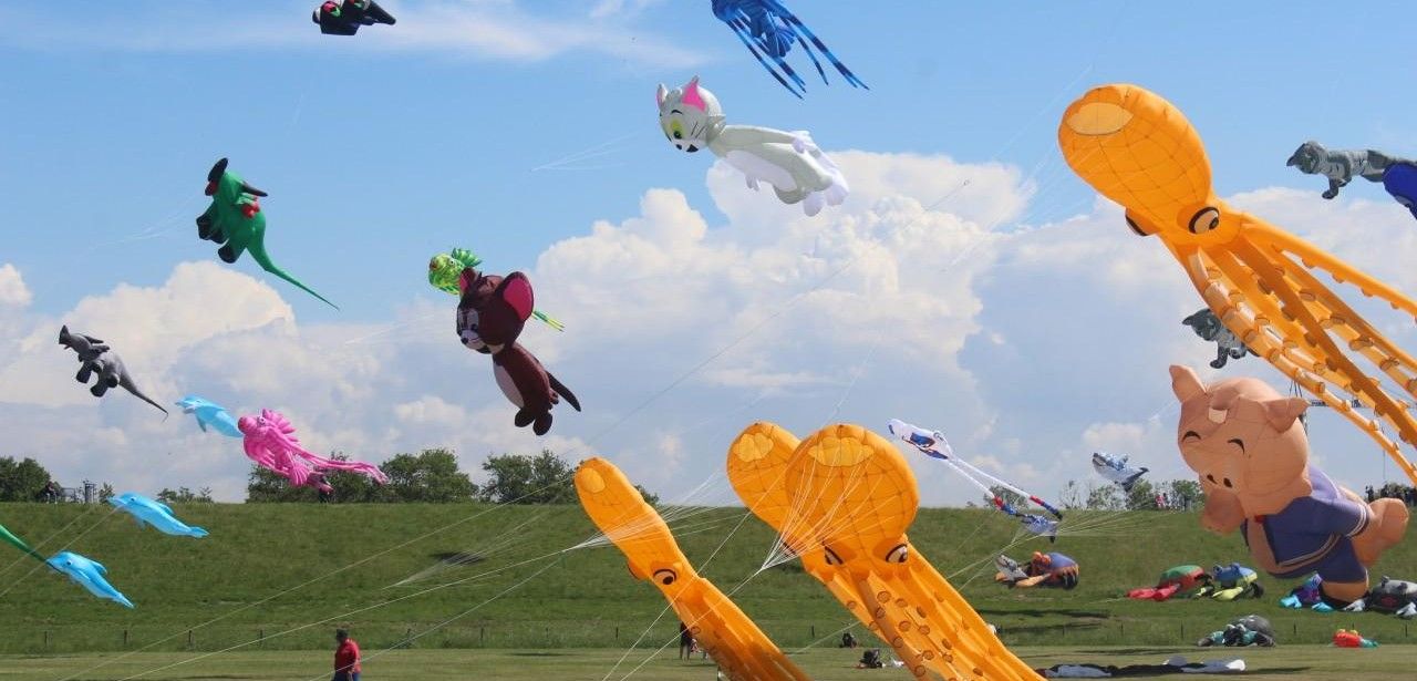 Lebendiges Festivalambiente kombiniert Drachenkunst Artistik und Meeresbrise an Küste